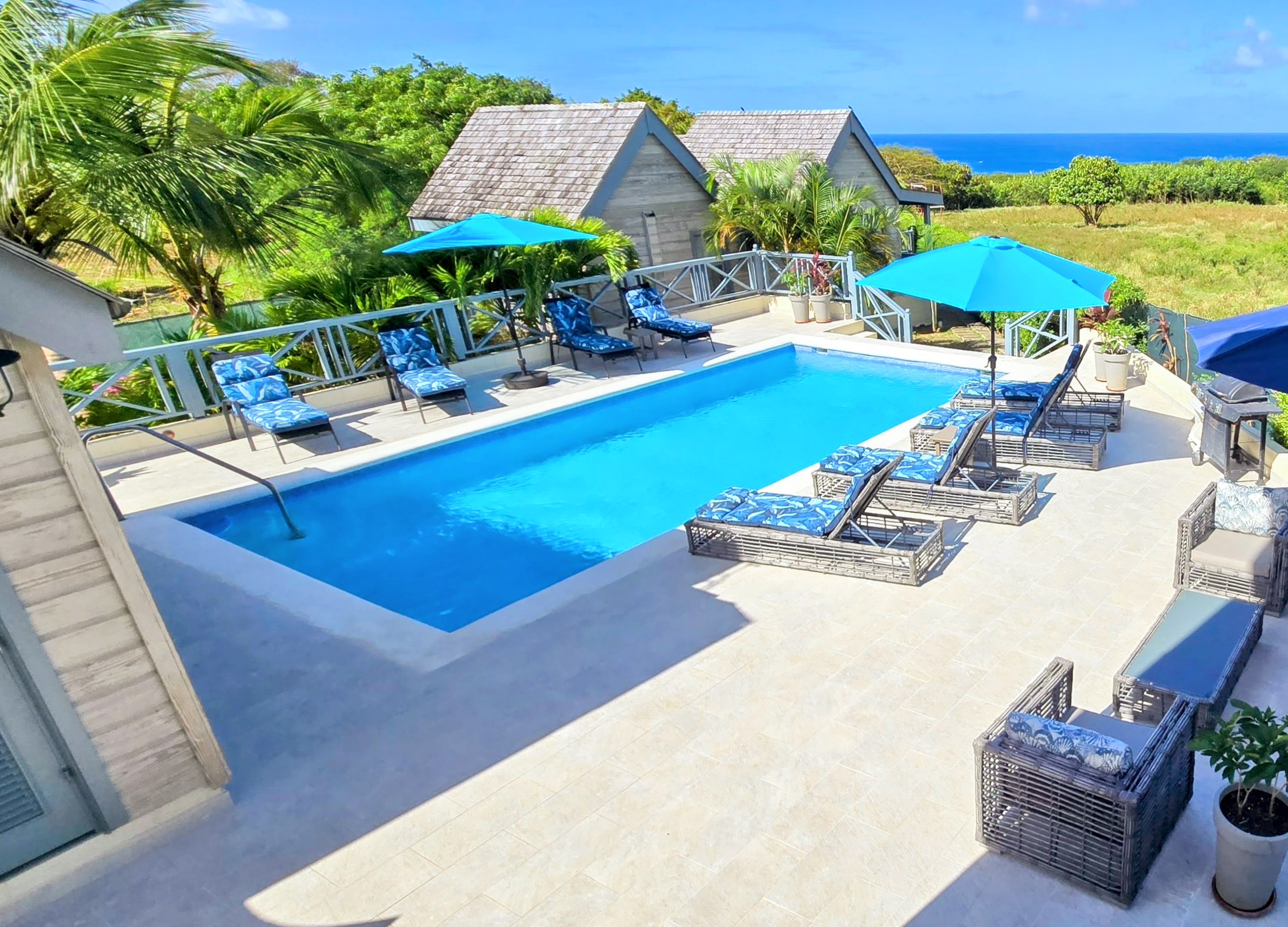 Fabulously romantic Queen size four poster bed in the front Master bedroom, dressed with quality cotton linens and en-suite shower room with ample storage. Traditional louvred doors open fully to a spacious covered terrace with seating for two and the most amazing panoramic view of the ocean beyond.